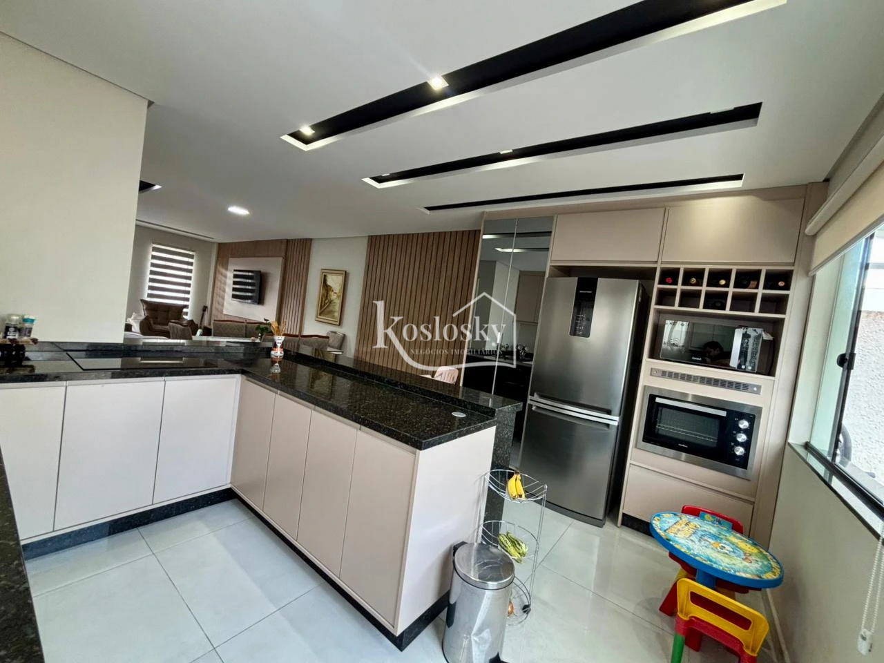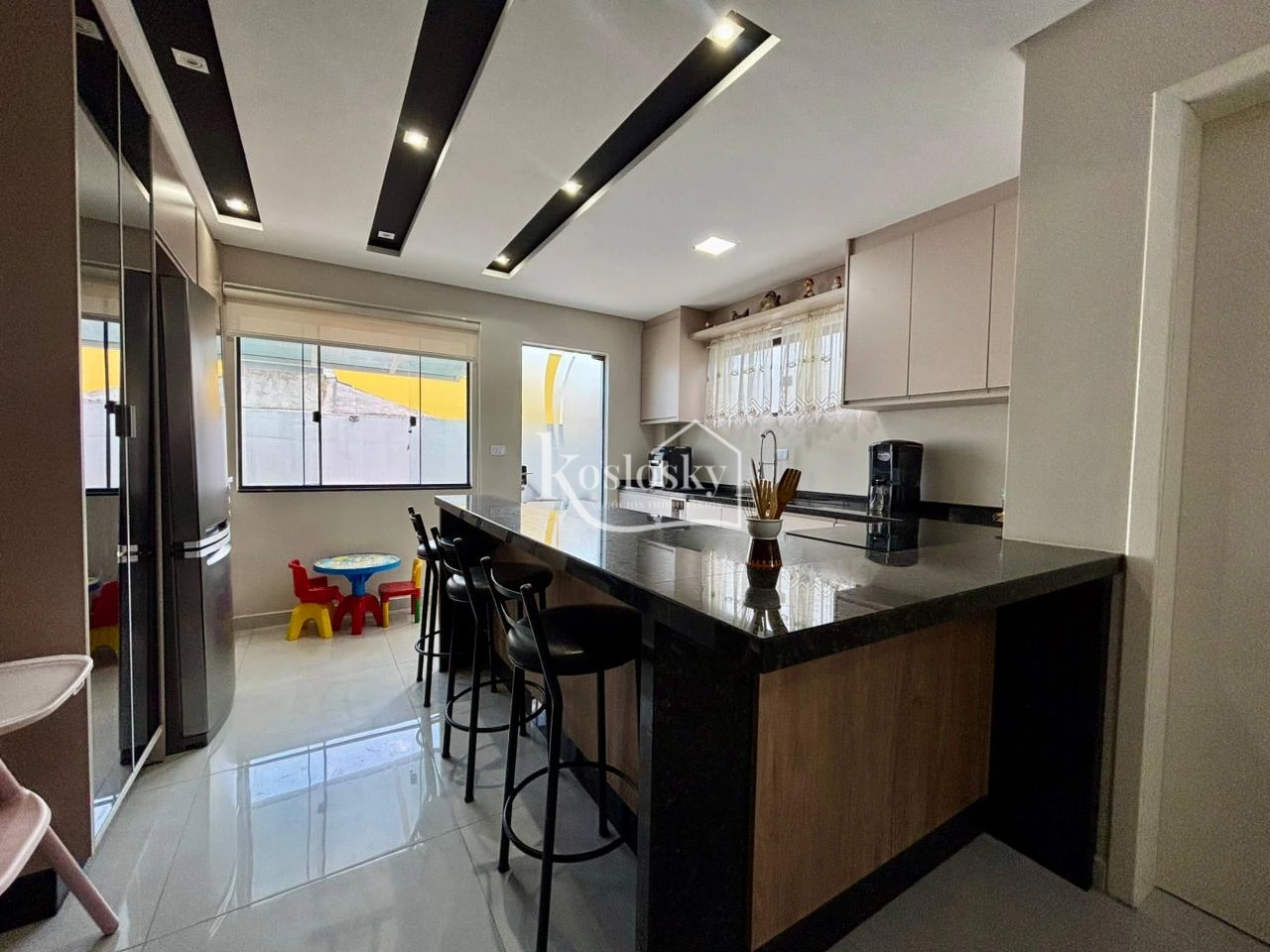 No pavimento térreo, o sobrado conta com sala de estar, cozinha,, além de ambientes planejados.